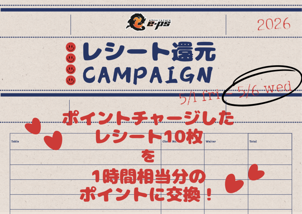 e-PSご利用時に過去、ポイントチャージしたレシートを10枚1組で持参で1時間相当分のポイントに交換しちゃいます。もちろん20枚でも30枚でも同時還元もできます!ただし還元には条件があり当日3時間以上購入したら還元OKです。