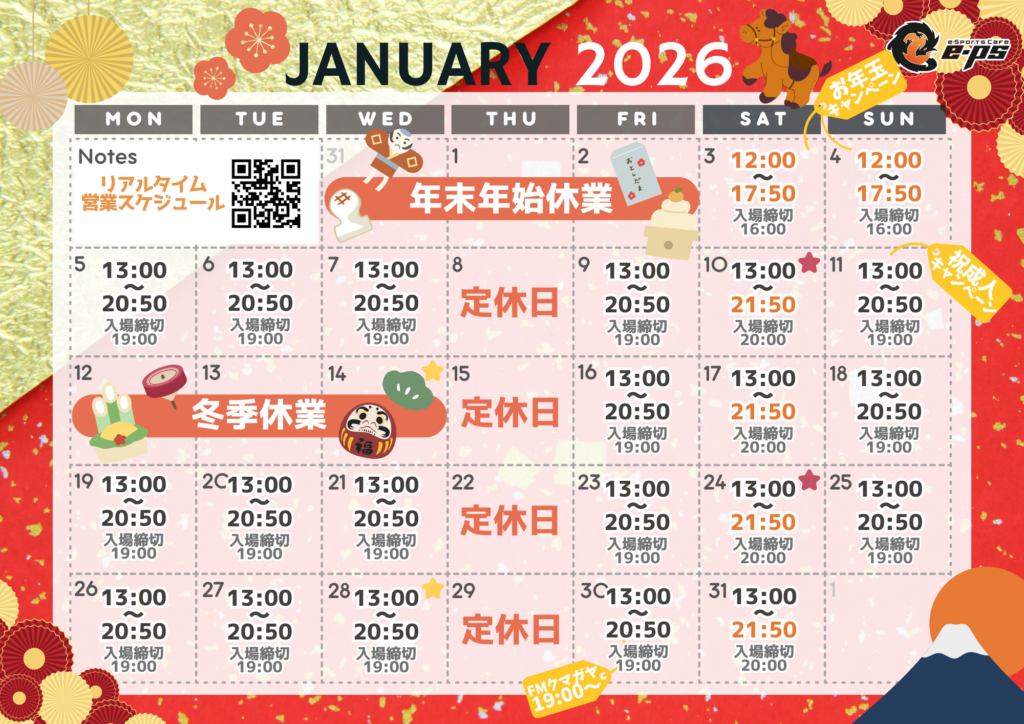 2025年1月の営業予定スケジュールが決まりましたが、営業日時が当店都合により流動的となる場合がございますので、e-PS eSports Cafeをご利用いただく前に「リアルタイム営業スケジュール」をご確認願います。なお、営業日時は