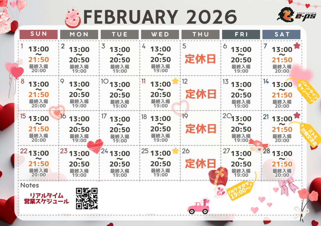 2026年2月の営業予定スケジュールが決まりましたが、営業日時が当店都合により流動的となる場合がございますので、e-PS eSports Cafeをご利用いただく前に「リアルタイム営業スケジュール」を優先致しますのでご来店前にご確認願います。なお、