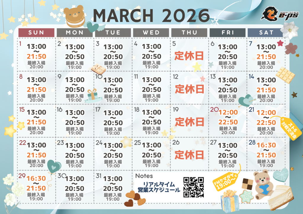 2026年3月の営業予定スケジュールが決まりましたが、営業日時が当店都合により流動的となる場合がございますので、e-PS eSports Cafeをご利用いただく前に「リアルタイム営業スケジュール」を優先致しますのでご来店前にご確認願います。
