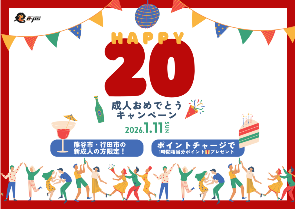 新成人のみなさま、ご成人おめでとうございます! 大人としての新たな門出を心よりお祝いするとともに、これからの人生が実り多きものとなることを願っています◎ 熊谷市・行田市に在住・在学で、2025年度にご成人をお迎えになられた新成人のみなさま限定で e-PS eSports Cafe ではキャンペーンを行います! 熊谷市の成人式当日1/11(日)にご来店いただきポイントチャージをしていただいたお客様にPC利用1時間相当分のポイントをプレゼント!身分証明書をご掲示いただければキャンペーン対象となります。成人式に参加できなくもOK! 20歳を超えてもなお、たのしいゲームライフを送られますように