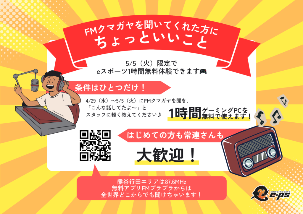 4/29㈬~5/5㈫にFMクマガヤ を聞き、5/5に内容をスタッフに軽く教えてくださると……ゲーミングPCを1時間無料でご体験いただけるキャンペーンを実施! 普段FMクマガヤをお聴きの方も、 当店を気になっていたけれどなかなかきっかけがなくて……な方も、 ぜひこの機会に熊谷を共に盛り上げるFMクマガヤ、そしてe-PS eSports Cafeをご利用ください!